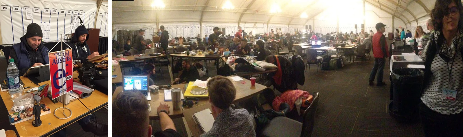 Party sehr gelungen. Am nächsten Morgen startet des offizielle Programm: Workshops, Vorträge, Arbeitsplatzerl einrichten, Thema für den Wettbewerb überlegen ....
