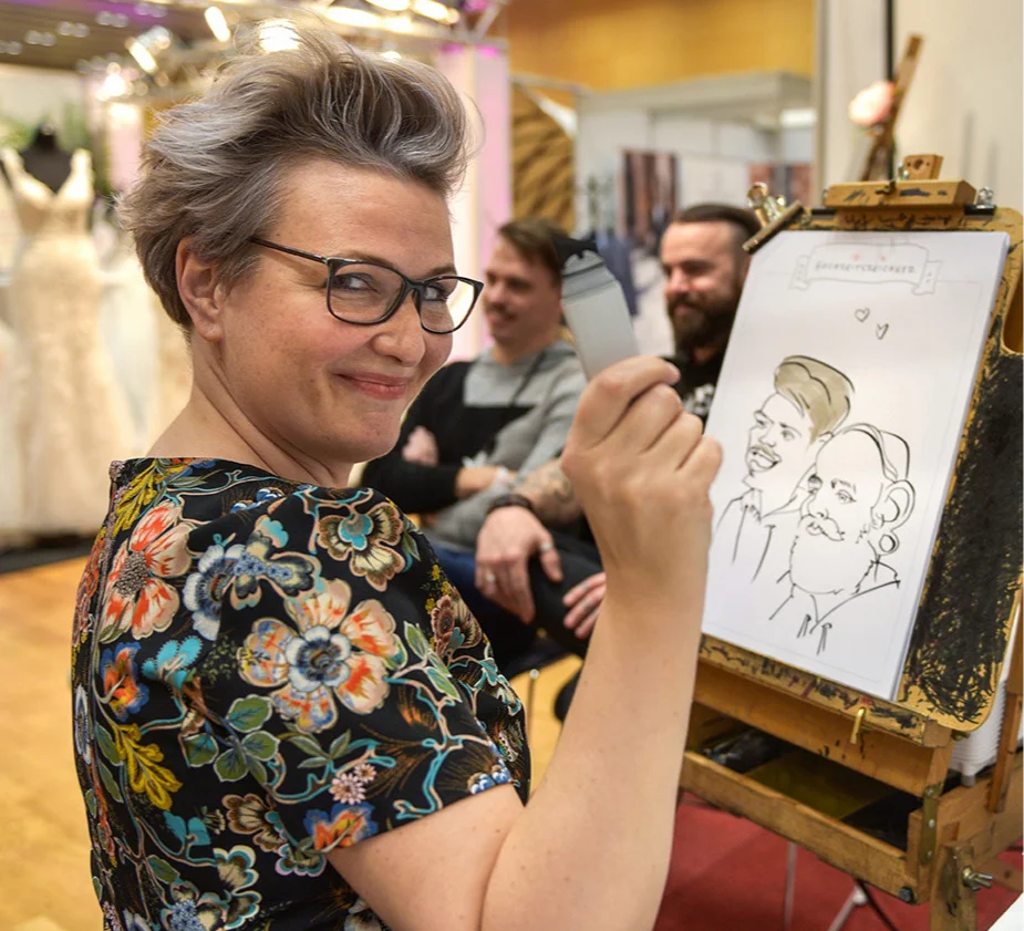 Ob beim Baustellenfest unter der A23 in Wien oder bei der Hochzeit im Schlosshotel am Wörthersee, eine Schnellzeichnerin peppt jedes Fest auf.